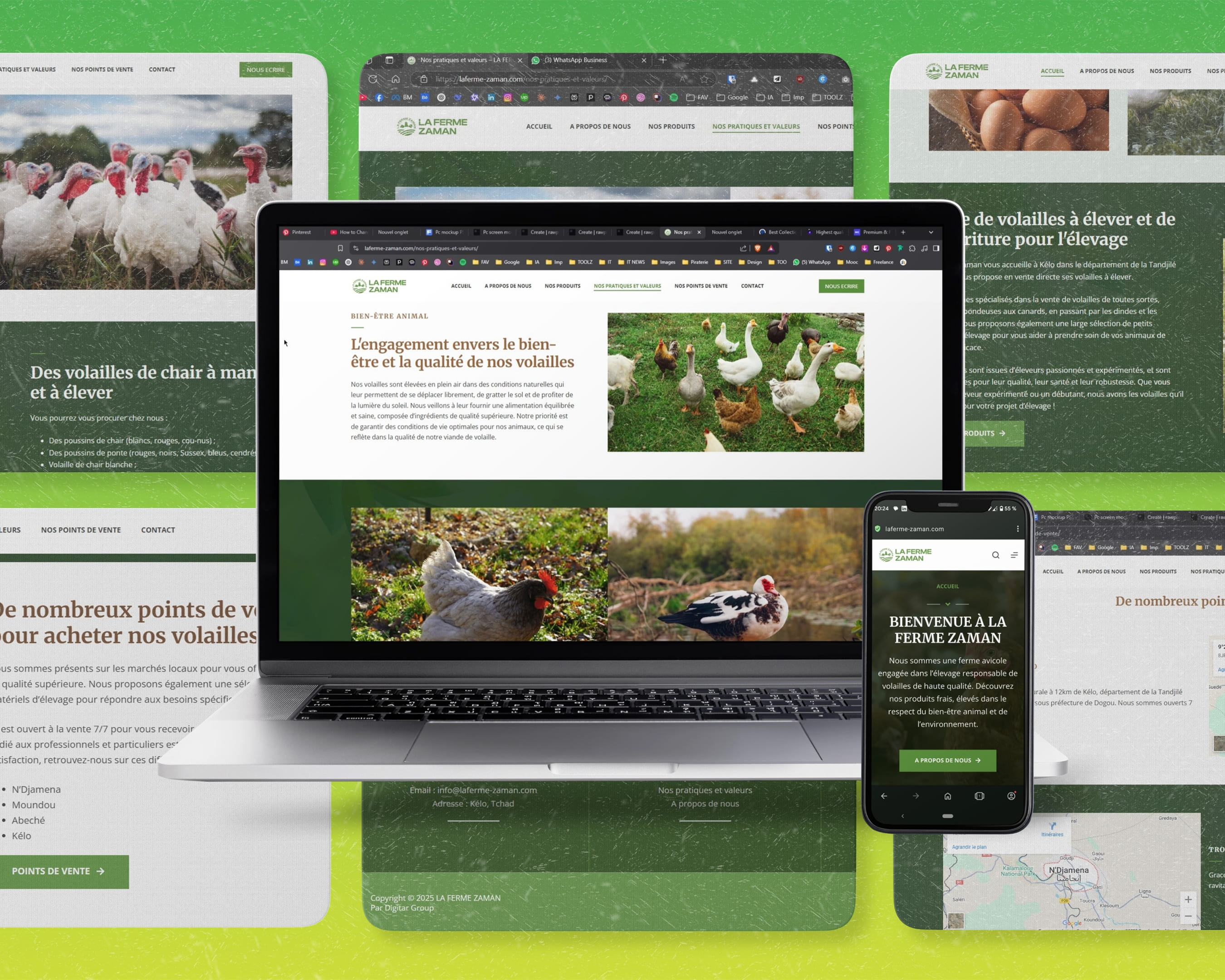 Une vitrine digitale qui donne à La Ferme Zaman une crédibilité institutionnelle sans perdre la proximité qui fait sa force. Le site couvre l'ensemble du territoire tchadien avec une navigation claire vers les 4 points de vente, et positionne la ferme comme référence avicole dans la région de la Tandjilé - en rendant ses lettres de noblesse à une tradition d'élevage qui remonte à plusieurs décennies.